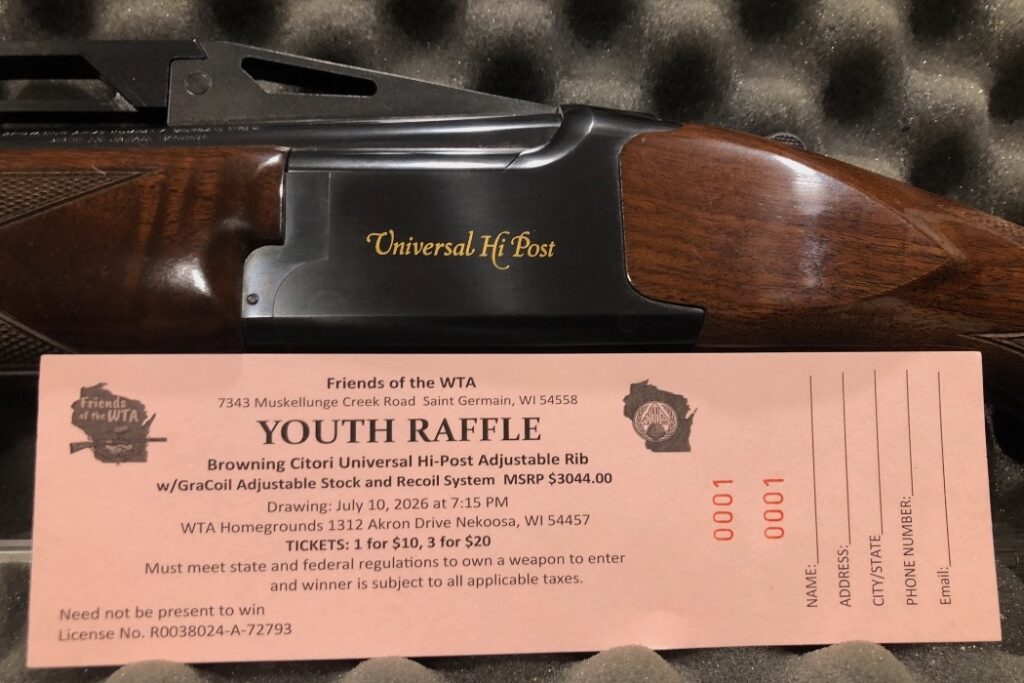 Tickets are $10 each, or three tickets for $20! The drawing will be held at the WTA Homegrounds during the 2026 Wisconsin State Shoot, July 10th at 7:15 PM. You do not need to be present to win.
